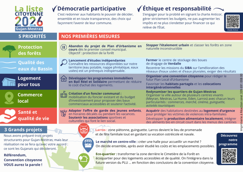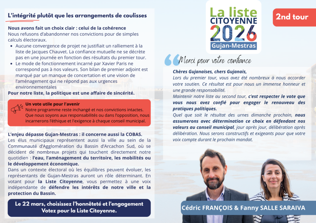 Au moment de faire votre choix, pensez au nouveau souffle dont Gujan-Mestras a besoin. Le renouveau positif ne peut être porté que par une démarche citoyenne, libre et engagée pour l’environnement et la démocratie participative.