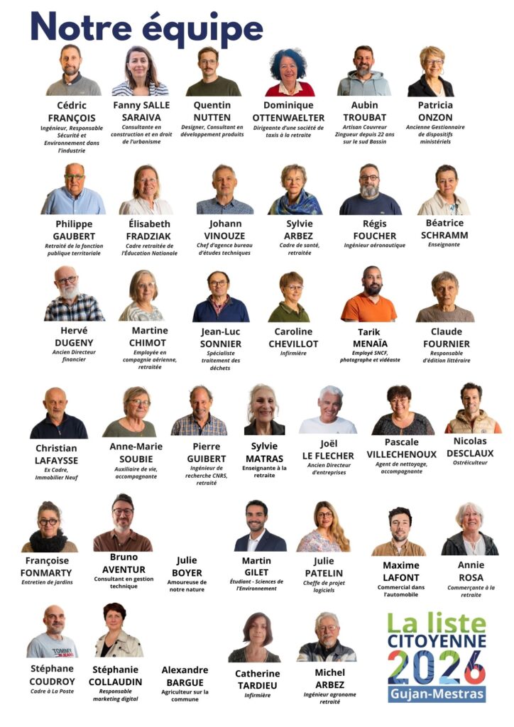 • Cédric FRANÇOIS, 47 ans : ingénieur Arts et Métiers, Cédric habite à Gujan-Mestras depuis plus de 10 ans. Frustré par le mépris de la parole citoyenne dans les décisions locales, il a rejoint la liste pour porter concrètement les principes de démocratie participative au niveau municipal.